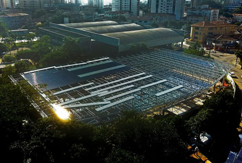 Estruturas metálicas espaciais tubulares em aço ou alumínio ou estruturas metálicas convencionais em aço, em um sistema de fornecimento que integra projeto de engenharia, suprimento, industrialização, acabamento e montagem final, incluindo coberturas e fechamentos laterais.